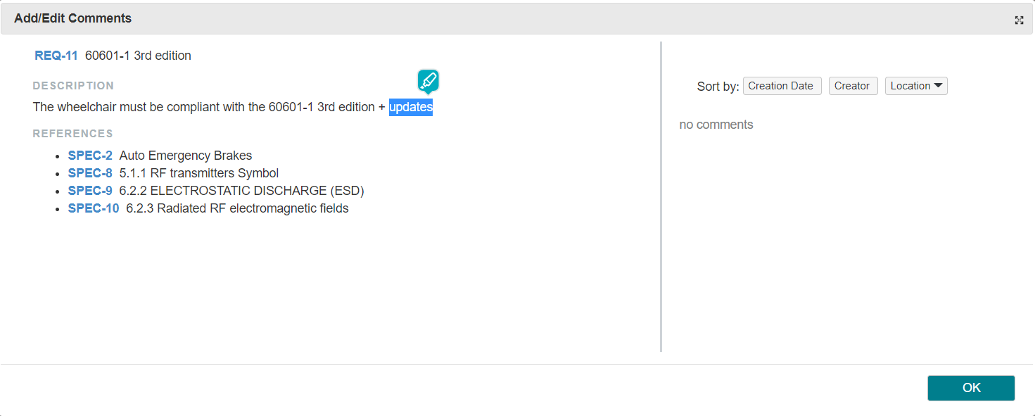 To annotate with inline comments, you can highlight the part of text that requires a comment and add the comment clicking on the pencil above it. The comment will appear on the right side of the annotation box.